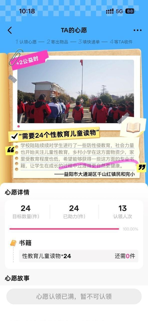 益阳市大通湖区千山红镇民和完小的老师想要24本性教育儿童读物。“我们学校百分之四十是留守儿童,监护人教育水平不高,社会风气也较为保守。我们希望孩子在性教育方面也能受到好的教育,树立正确的三观,保护好自己”。截至5月,24本性教育儿童读物的需求已全部领取完毕。